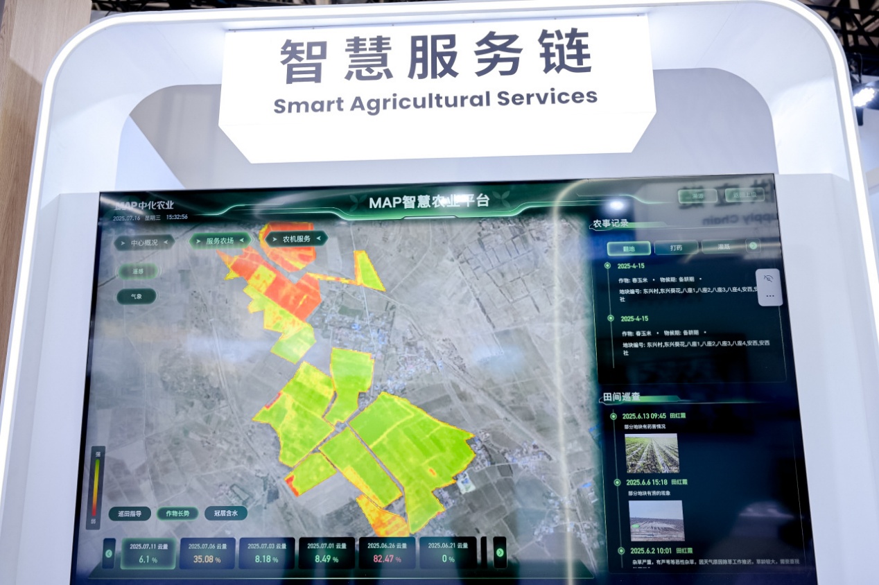 在“科技创新链”展台,中化农业 MAP智慧农业平台作为先正达集团科技创新成果的重要体现,通过将农艺知识转化为可复制的数字模型, 为农户提供科学种植的决策依据和覆盖“耕-种-管-收”全流程的种植定量决策方案,让农户切实感受到科技带来的高效和便利。目前,该平台线上服务面积已超过1亿亩。