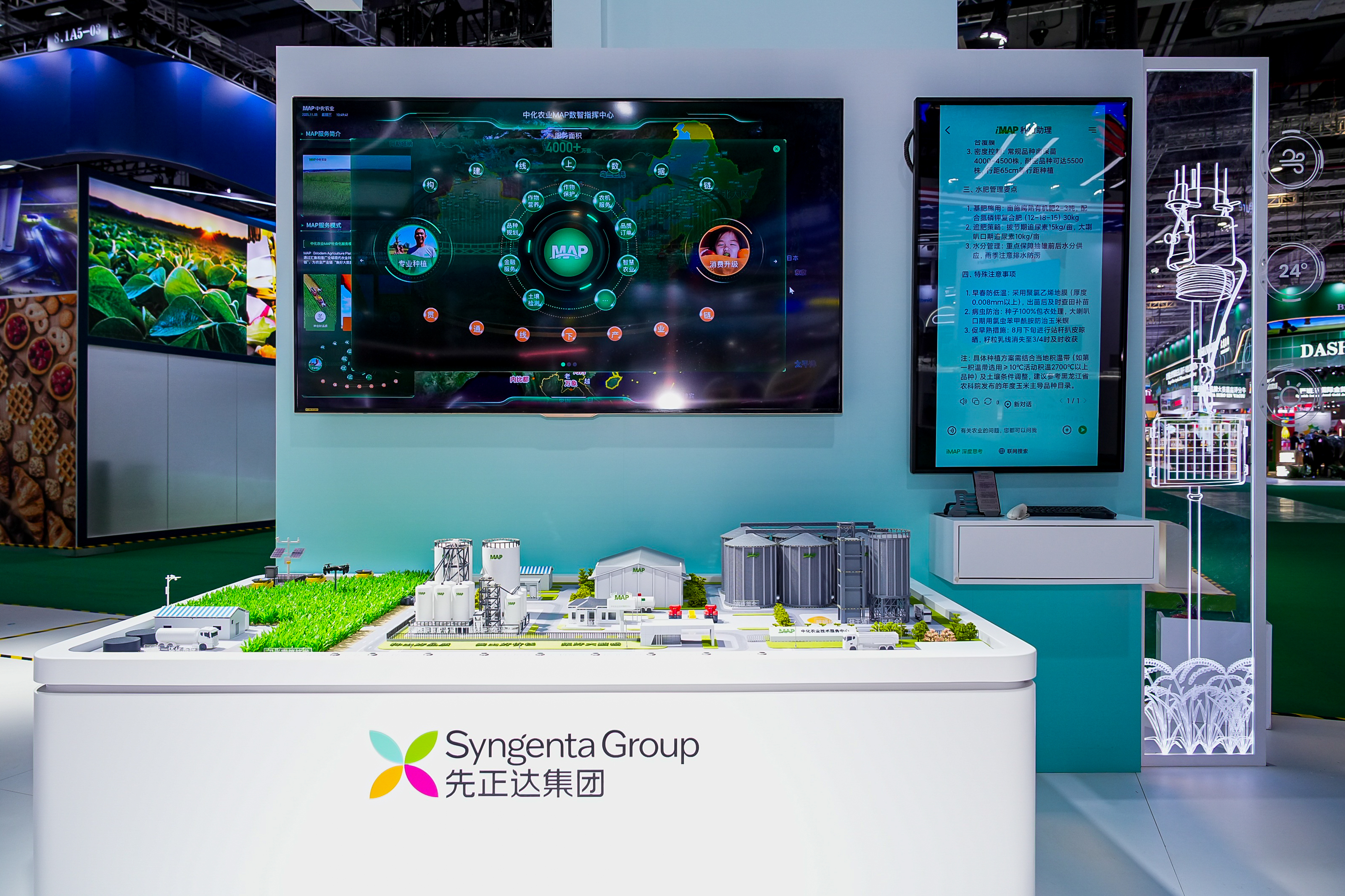 与iMAP农业种植综合大模型的AI赋能相得益彰,展台上的中化农业MAP沙盘以场景化呈现MAP技术服务的全景缩影。沙盘聚焦“玉米高产密植”与“水肥一体化精准灌溉”核心方案,将规模化种植的单产提升秘籍清晰解码,让参观嘉宾直观了解中化农业MAP全程技术解决方案的产生和应用过程。
