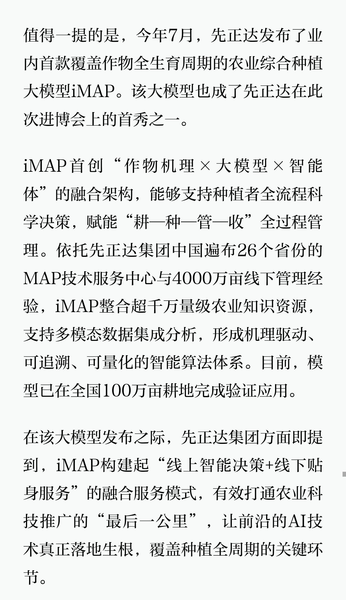 目前,“iMAP”首版产品正在内蒙古和东北等主要粮食产区开展应用验证,围绕玉米等主粮作物,试点面积已累计100万亩,初步实践成效显著。